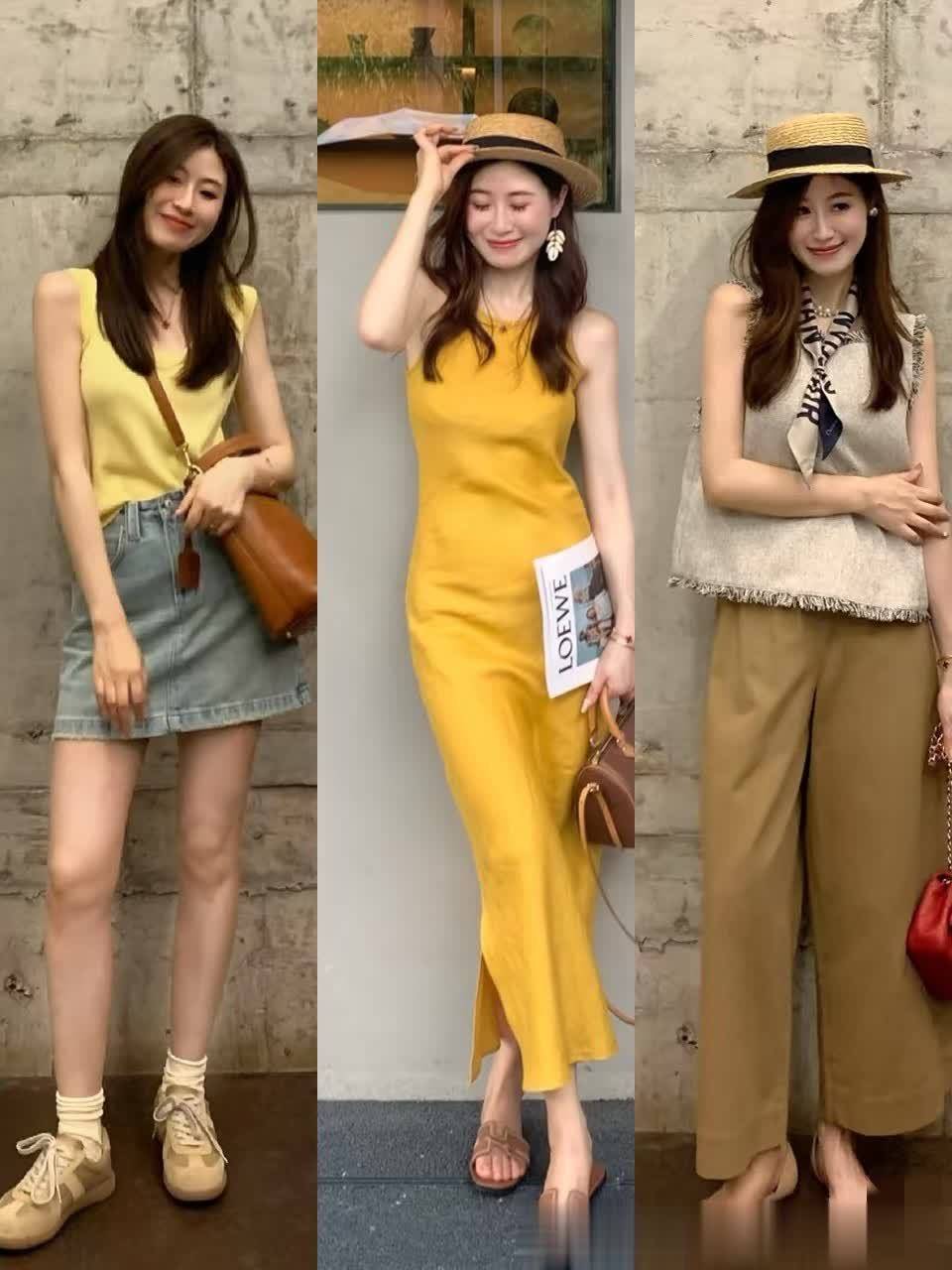 从浅鹅黄的无袖上衣,到姜黄的收腰针织衫,再到亮黄的百褶长裙,每一套都在诉说着春天的故事。搭配白色缎面鱼尾裙,是优雅的都市丽人;配上微喇牛仔裤,是随性的街头少女;而波点百褶裙,则自带复古浪漫的滤镜。